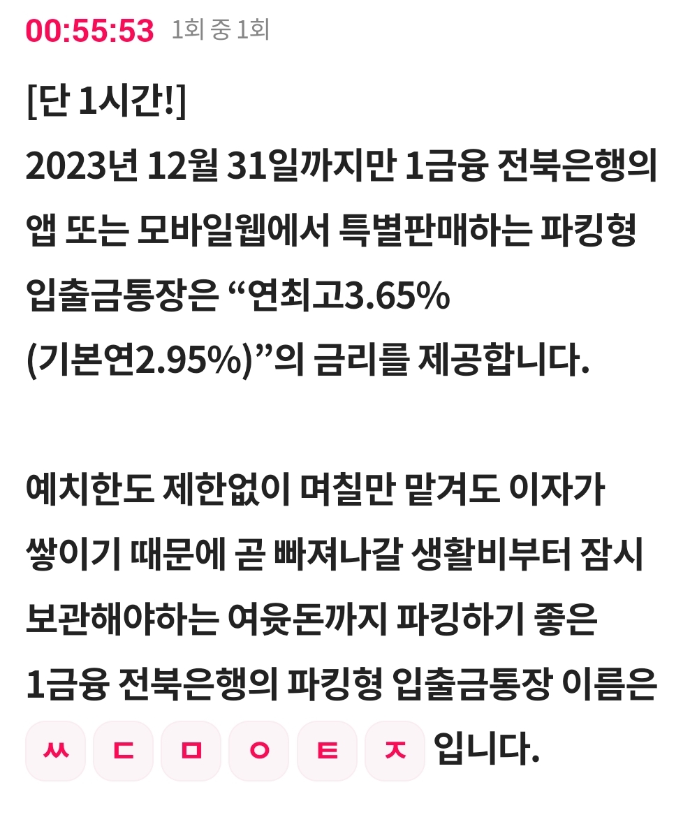 2023년 12월 31일까지만 1금융 전북은행의 앱 또는 모바일웹에서 특별판매하는 파킹형 입출금통장은 “연최고3.65%(기본연2.95%)”의 금리를 제공합니다.