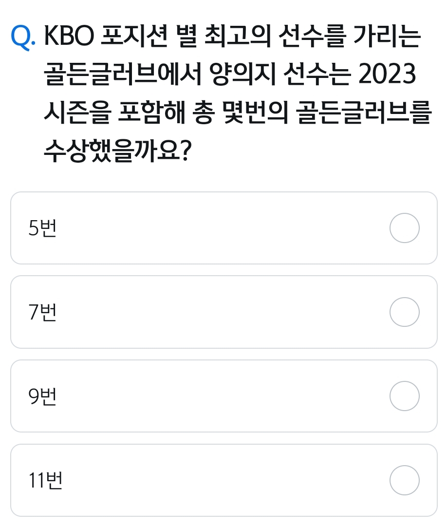 신한쏠 야구 퀴즈 KBO 포지션 별 최고의 선수를 가리는 골든글러브에서 양의지 선수는 2023 시즌을 포함해 총 몇번의 골든글러브를 수상했을까요?2023년 12월 13일