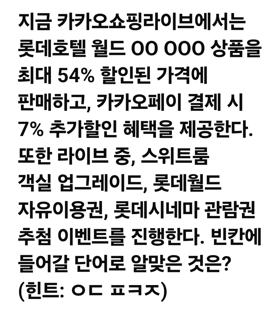 지금 카카오쇼핑라이브에서는 롯데호텔 월드 OO OOO 상품을 최대 54% 할인된 가격에 판매하고, 카카오페이 결제 시 7% 추가할인 혜택을 제공한다. 또한 라이브 중, 스위트룸 객실 업그레이드, 롯데월드 자유이용권, 롯데시네마 관람권 추첨 이벤트를 진행한다. 빈칸에 들어갈 단어로 알맞은 것은? (힌트: ㅇㄷ ㅍㅋㅈ)2023년 12월 14일 2023년 12월 14일
