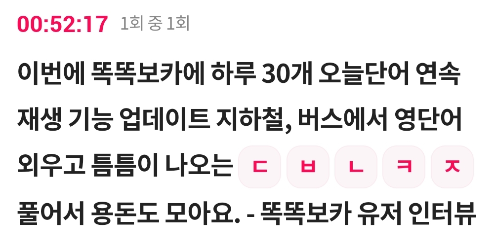 카테고리 없음 이번에 똑똑보카에 하루 30개 오늘단어 연속 재생 기능 업데이트 지하철, 버스에서 영단어 외우고 틈틈이 나오는 ㄷ ㅂ ㄴ ㅋ ㅈ 풀어서 용돈도 by 갑자_ 2023. 12. 23. 이번에 똑똑보카에 하루 30개 오늘단어 연속 재생 기능 업데이트 지하철, 버스에서 영단어 외우고 틈틈이 나오는 ㄷ ㅂ ㄴ ㅋ ㅈ 풀어서 용돈도 모아요. - 똑똑보카 유저 인터뷰정답 복사 → : 돈버는퀴즈 반응형 공유하기 게시글 관리 퀴즈 정답(실시간) 카톡으로 공유하기 댓글