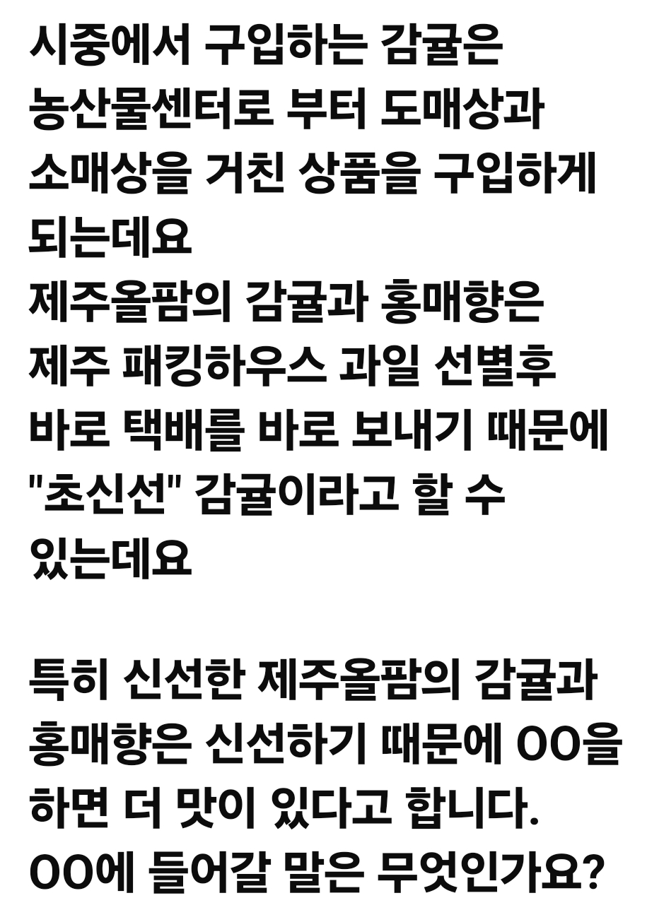 특히 신선한 제주올팜의 감귤과 홍매향은 신선하기 때문에 OO을 하면 더 맛이 있다고 합니다.