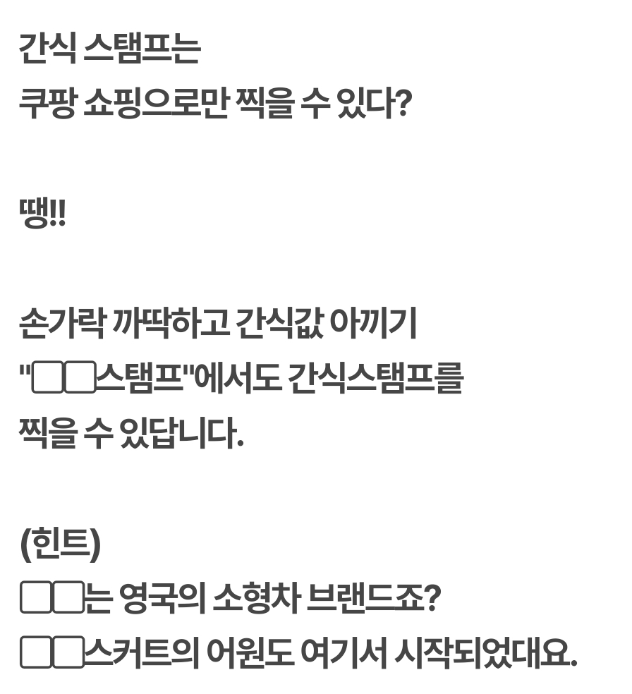 카테고리 없음 간식 스탬프는 쿠팡 쇼핑으로만 찍을 수 있다? 땡!! 손가락 까딱하고 간식값 아끼기 "▢▢스탬프"에서도 간식스탬프를 찍을 수 있답니다. ( by 갑자_ 2023. 12. 24. 간식 스탬프는쿠팡 쇼핑으로만 찍을 수 있다?땡!!손가락 까딱하고 간식값 아끼기"▢▢스탬프"에서도 간식스탬프를찍을 수 있답니다.(힌트)▢▢는 영국의 소형차 브랜드죠?▢▢스커트의 어원도 여기서 시작되었대요.정답 복사 → : 미니 반응형 공유하기 게시글 관리 퀴즈 정답(실시간) 카톡으로 공유하기 댓글