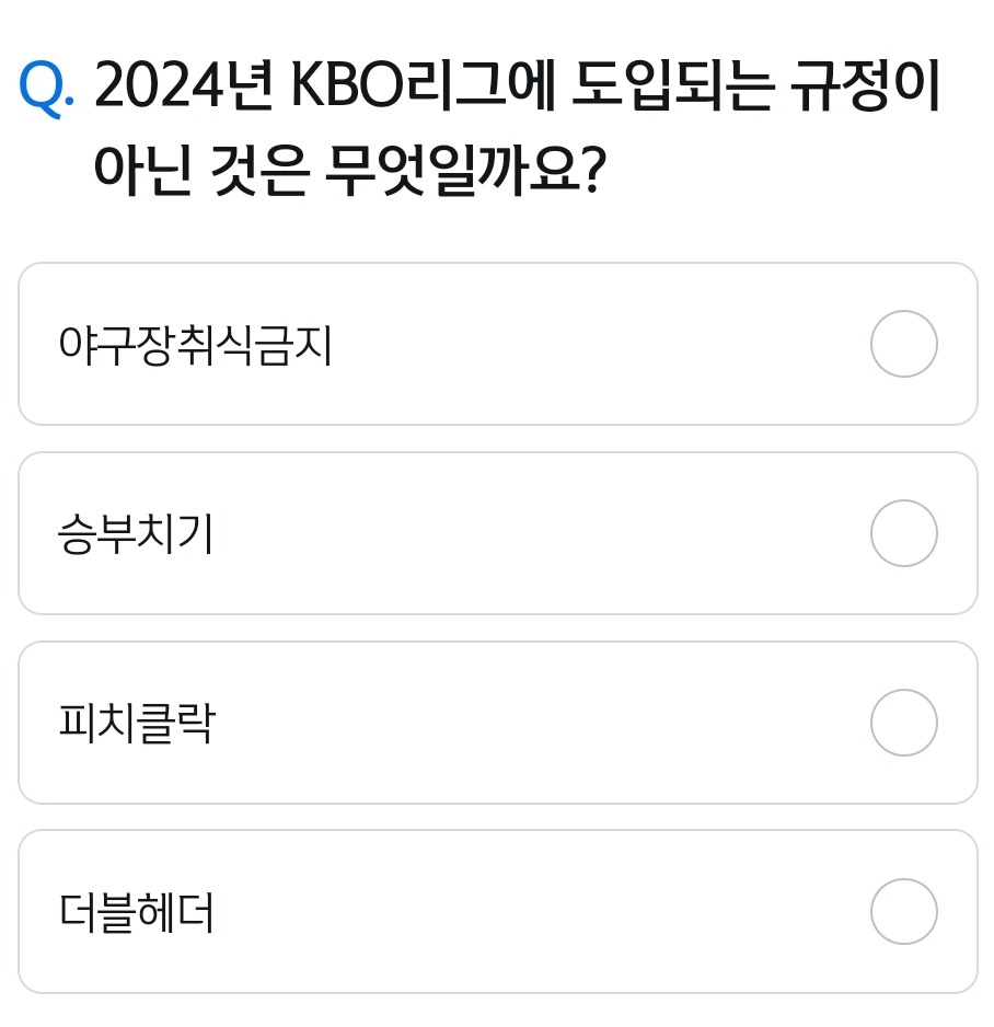 카테고리 없음 Q. 2024년 KBO리그에 도입되는 규정이 아닌 것은 무엇일까요? 야구장취식금지 승부치기 피치클락 더블헤더 by 갑자_ 2024. 1. 3. Q. 2024년 KBO리그에 도입되는 규정이아닌 것은 무엇일까요?야구장취식금지승부치기피치클락더블헤더정답 복사 → : 야구장취식금지 반응형 공유하기 게시글 관리 퀴즈 정답(실시간) 카톡으로 공유하기 댓글