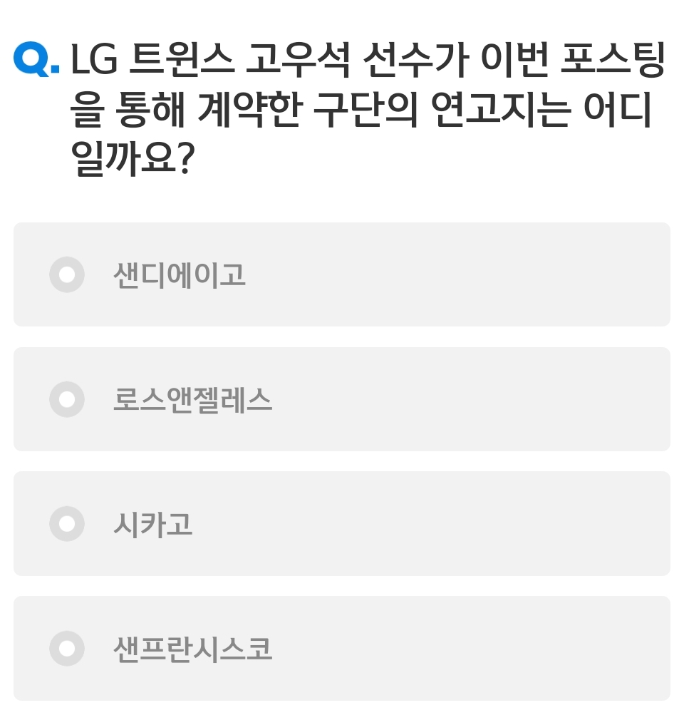 카테고리 없음 Q. LG 트윈스 고우석 선수가 이번 포스팅 을 통해 계약한 구단의 연고지는 어디 일까요? 샌디에이고 로스앤젤레스 시카고 샌프란시스코 by 갑자_ 2024. 1. 5. Q. LG 트윈스 고우석 선수가 이번 포스팅을 통해 계약한 구단의 연고지는 어디일까요?샌디에이고로스앤젤레스시카고샌프란시스코정답 복사 → : 샌디에이고 반응형 공유하기 게시글 관리 퀴즈 정답(실시간) 카톡으로 공유하기 댓글