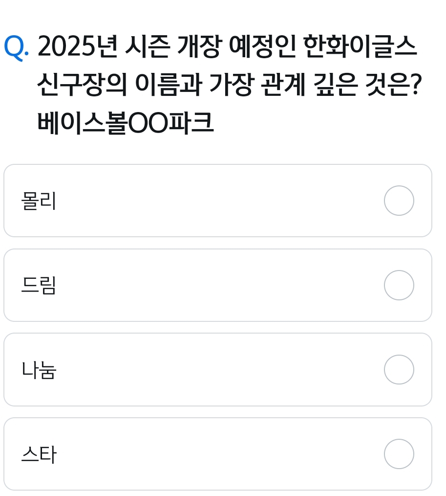 카테고리 없음 2025년 시즌 개장 예정인 한화이글스 신구장의 이름과 가장 관계 깊은 것은? 베이스볼0O파크 by 갑자_ 2024. 1. 9. 2025년 시즌 개장 예정인 한화이글스신구장의 이름과 가장 관계 깊은 것은?베이스볼0O파크정답 복사 → : 드림 반응형 공유하기 게시글 관리 퀴즈 정답(실시간) 카톡으로 공유하기 댓글