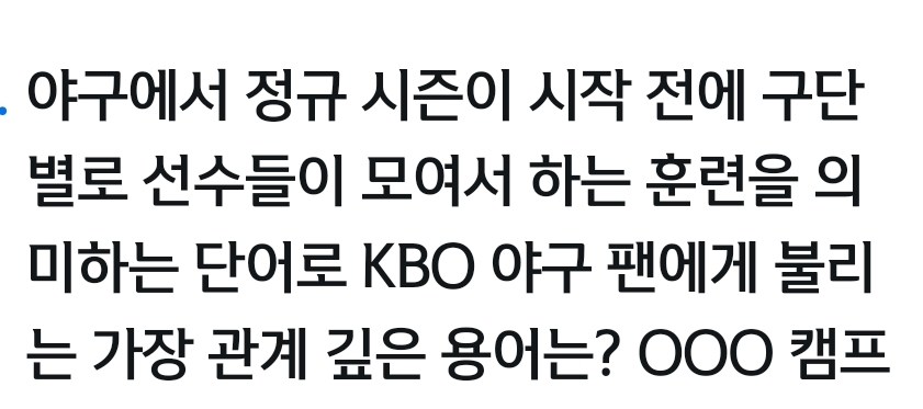 카테고리 없음 야구에서 정규 시즌이 시작 전에 구단 별로 선수들이 모여서 하는 훈련을 의 미하는 단어로 KBO 야구 팬에게 불리 는 가장 관계 깊은 용어는? by 갑자_ 2024. 1. 15. 야구에서 정규 시즌이 시작 전에 구단별로 선수들이 모여서 하는 훈련을 의미하는 단어로 KBO 야구 팬에게 불리는 가장 관계 깊은 용어는? 000 캠프야구에서 정규 시즌이 시작 전에 구단별로 선수들이 모여서 하는 훈련을 의미하는 단어로 KBO 야구 팬에게 불리는 가장 관계 깊은 용어는? 000 캠프정답 복사 → : 스프링 다른답↓ 반응형 공유하기 게시글 관리 퀴즈 정답(실시간) 카톡으로 공유하기 댓글