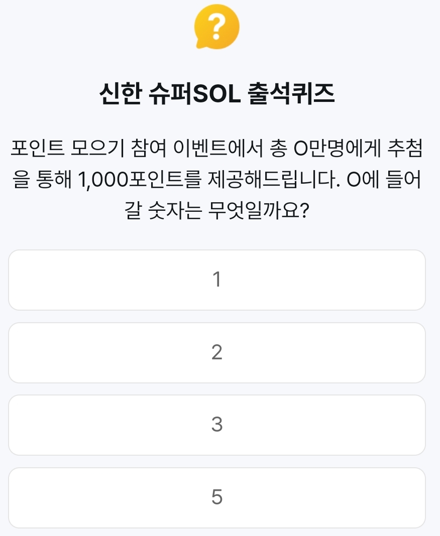 신한 슈퍼SOL 출석퀴즈 포인트 모으기 참여 이벤트에서 총 0만명에게 추첨 을 통해 1,000포인트를 제공해드립니다. 0에 들어 갈숫자는 무엇일까요? 2024년 1월 16일