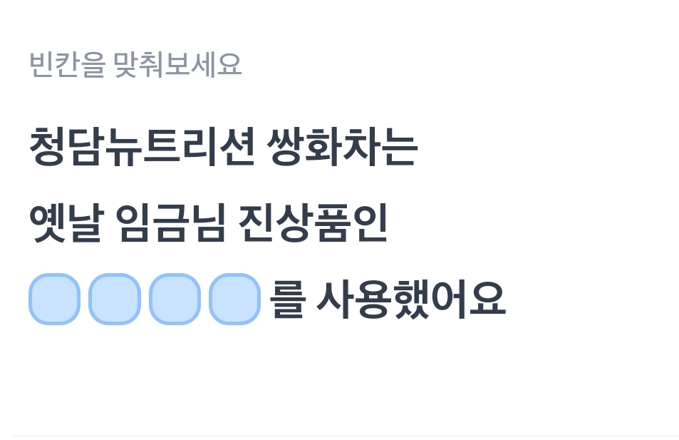 카테고리 없음 청담뉴트리션 쌍화차는 옛날 임금님 진상품인 ㅂㅇㄷㅊ를 사용했어요 ㄱㄴㅅ by 갑자_ 2024. 1. 18. 청담뉴트리션 쌍화차는옛날 임금님 진상품인 ㅂㅇㄷㅊ를 사용했어요 ㄱㄴㅅ청담뉴트리션 쌍화차는옛날 임금님 진상품인 ㅂㅇㄷㅊ를 사용했어요 ㄱㄴㅅ 정답 복사 → : 보은대추정답 복사 → : 국내산다른답↓ 반응형 공유하기 게시글 관리 퀴즈 정답(실시간) 카톡으로 공유하기 댓글