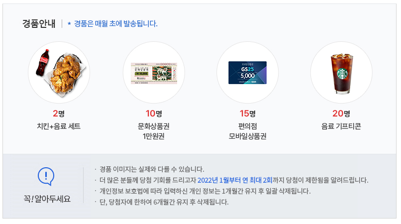매주 퀴즈가 열리니 참여 하시면 좋겠고요 더 많은 분들께 당첨 기회를 드린다고 22년 1월 부터 연 최대 2회까지 당첨이 제한된다고 합니다. 개인 정보는 1개월 유지후 일괄 삭제 된다고 하니 걱정 안하셔도 되겠네요