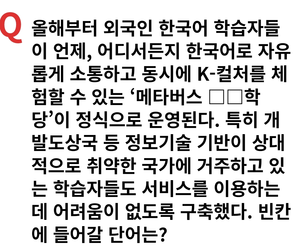 Q올해부터 외국인 한국어 학습자들이 언제, 어디서든지 한국어로 자유롭게 소통하고 동시에 K-컬처를 체험할 수 있는 ‘메타버스 □□학당’이 정식으로 운영된다. 특히 개발도상국 등 정보기술 기반이 상대적으로 취약한 국가에 거주하고 있는 학습자들도 서비스를 이용하는 데 어려움이 없도록 구축했다. 빈칸에 들어갈 단어는?