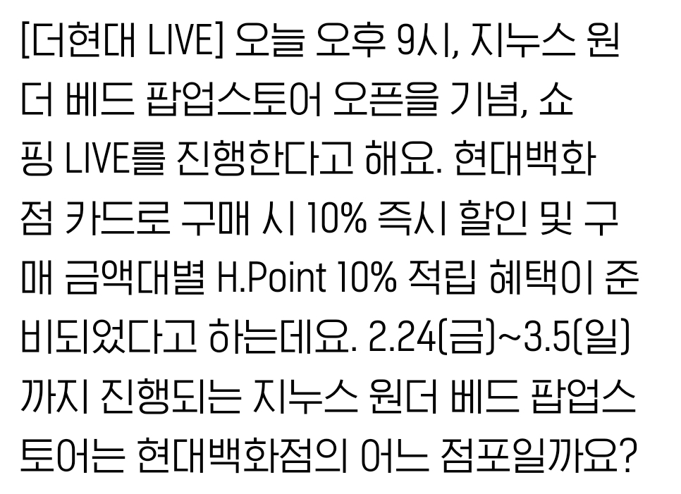 카테고리 없음 [더현대 LIVE] 오늘 오후 9시, 지누스 원더 베드 팝업스토어 오픈을 기념, 쇼핑 LIVE를 진행한다고 해요. 현대백화점 카드로 구매 시 1 by 갑자_ 2023. 2. 27. [더현대 LIVE] 오늘 오후 9시, 지누스 원더 베드 팝업스토어 오픈을 기념, 쇼핑 LIVE를 진행한다고 해요. 현대백화점 카드로 구매 시 10% 즉시 할인 및 구매 금액대별 H.Point 10% 적립 혜택이 준비되었다고 하는데요. 2.24(금)~3.5(일)까지 진행되는 지누스 원더 베드 팝업스토어는 현대백화점의 어느 점포일까요 정답 → : 미아점 반응형 공유하기 게시글 관리 퀴즈 정답(실시간) 카톡으로 공유하기 댓글
