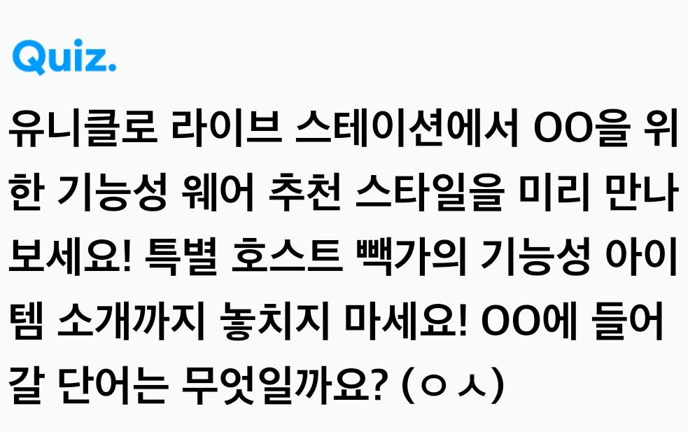 유니클로 라이브 스테이션에서 OO을 위한 기능성 웨어 추천 스타일을 미리 만나보세요! 특별 호스트 빽가의 기능성 아이템 소개까지 놓치지 마세요! OO에 들어갈 단어는 무엇일까요? (ㅇㅅ)