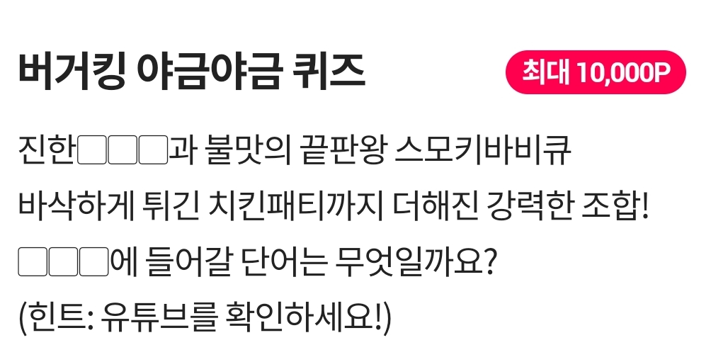진한▢▢▢과 불맛의 끝판왕 스모키바비큐 바삭하게 튀긴 치킨패티까지 더해진 강력한 조합! ▢▢▢에 들어갈 단어는 무엇일까요? (힌트: 유튜브를 확인하세요!)