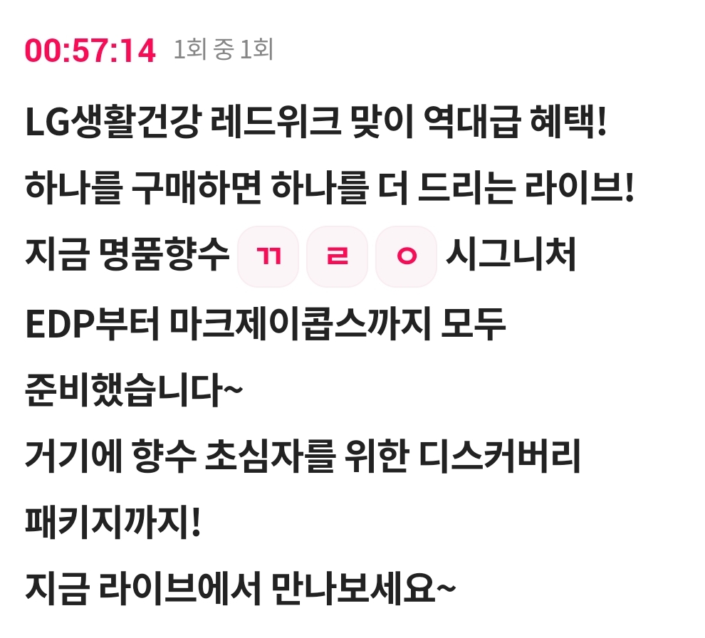 지금 명품향수 ㄲ ㄹ ㅇ 시그니처 EDP부터 마크제이콥스까지 모두 준비했습니다~거기에 향수 초심자를 위한 디스커버리 패키지까지!지금 라이브에서 만나보세요~