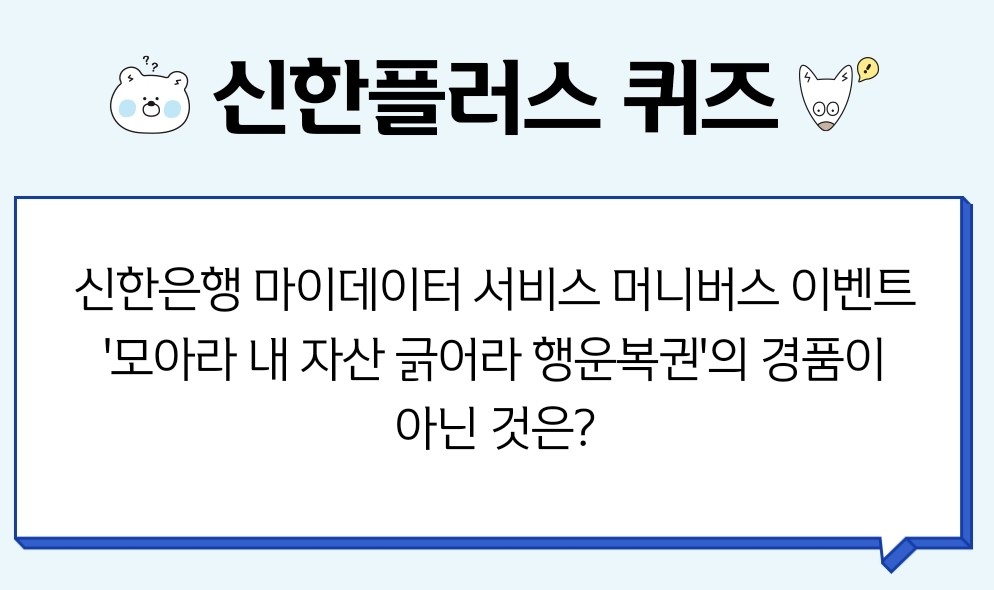 신한플러스 출석 퀴즈 신한은행 마이데이터 서비스 머니버스 이벤트 '모아라 내 자산 긁어라 행운복권'의 경품이 아닌 것은? 2023년 4월 18일
