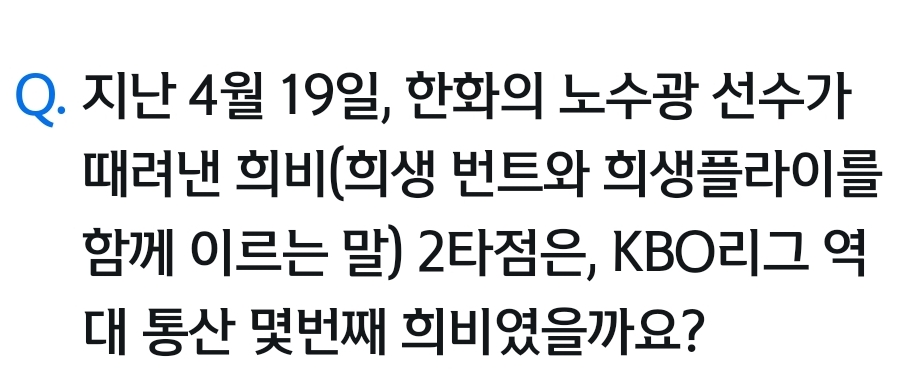 신한쏠 야구 퀴즈 지난 4월 19일, 한화의 노수광 선수가 때려낸 희비(희생 번트와 희생플라이를 함께 이르는 말) 2타점은, KBO리그 역 대 통산 몇번째 희비였을까요?