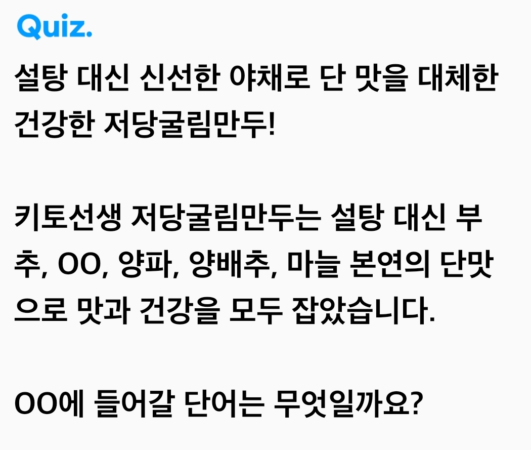 키토선생 저당굴림만두는 설탕 대신 부추, OO, 양파, 양배추, 마늘 본연의 단맛으로 맛과 건강을 모두 잡았습니다.