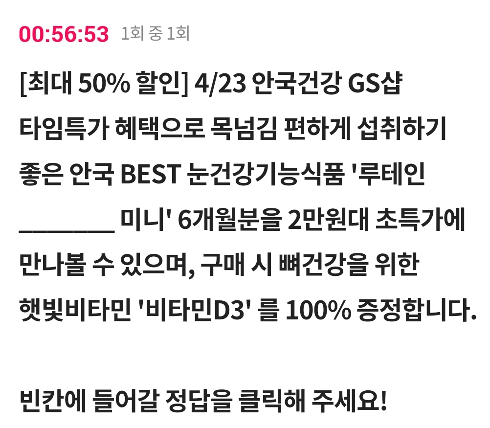 [최대 50% 할인] 4/23 안국건강 GS샵 타임특가 혜택으로 목넘김 편하게 섭취하기 좋은 안국 BEST 눈건강기능식품 '루테인 _______ 미니' 6개월분을 2만원대 초특가에 만나볼 수 있으며, 구매 시 뼈건강을 위한 햇빛비타민 '비타민D3' 를 100% 증정합니다.
