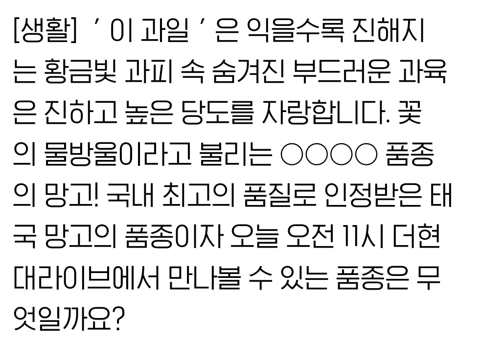 [생활] '이 과일'은 익을수록 진해지는 황금빛 과피 속 숨겨진 부드러운 과육은 진하고 높은 당도를 자랑합니다. 꽃의 물방울이라고 불리는 ○○○○ 품종의 망고! 국내 최고의 품질로 인정받은 태국 망고의 품종이자 오늘 오전 11시 더현대라이브에서 만나볼 수 있는 품종은 무엇일까요?