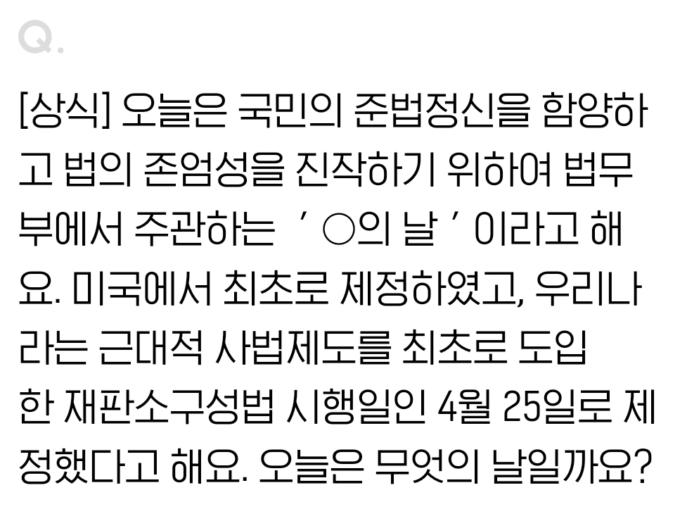 [상식] 오늘은 국민의 준법정신을 함양하고 법의 존엄성을 진작하기 위하여 법무부에서 주관하는 '○의 날'이라고 해요. 미국에서 최초로 제정하였고, 우리나라는 근대적 사법제도를 최초로 도입한 재판소구성법 시행일인 4월 25일로 제정했다고 해요. 오늘은 무엇의 날일까요?