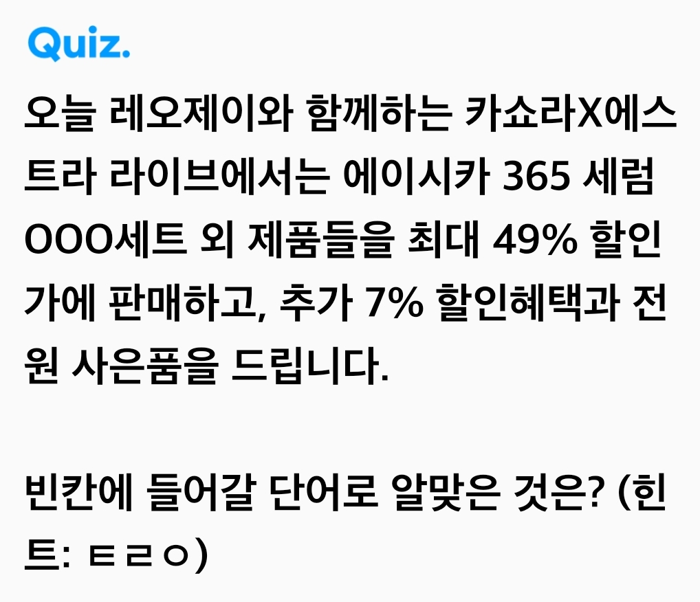 오늘 레오제이와 함께하는 카쇼라X에스트라 라이브에서는 에이시카 365 세럼 OOO세트 외 제품들을 최대 49% 할인가에 판매하고, 추가 7% 할인혜택과 전원 사은품을 드립니다.