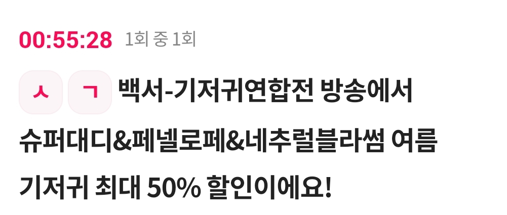 카테고리 없음 ㅅ ㄱ 백서-기저귀연합전 방송에서 슈퍼대디&페넬로페&네추럴블라썸 여름 기저귀 최대 50% 할인이에요! by 갑자_ 2023. 6. 5. ㅅ ㄱ 백서-기저귀연합전 방송에서 슈퍼대디&페넬로페&네추럴블라썸 여름 기저귀 최대 50% 할인이에요!정답 복사 → : 슬기 반응형 공유하기 게시글 관리 퀴즈 정답(실시간) 카톡으로 공유하기 댓글