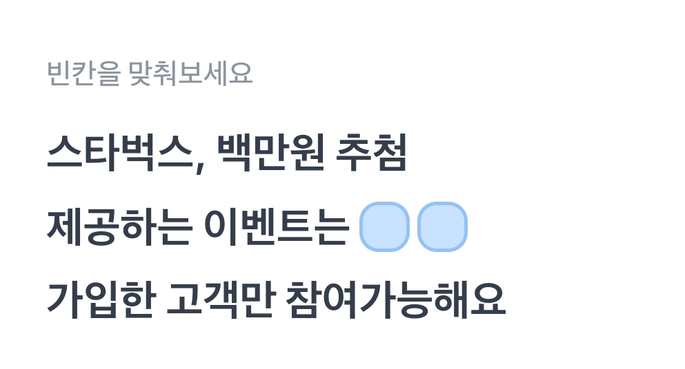 카테고리 없음 토스 행운 퀴즈 스타벅스, 백만원 추첨 제공하는 이벤트는 OO가입한 고객만 참여가능해요 ㅈㄱ토스 하이 정기적금 금리는 개인, 세전, 우대 포함 by 갑자_ 2023. 6. 8. 토스 행운 퀴즈 스타벅스, 백만원 추첨 제공하는 이벤트는 OO가입한 고객만 참여가능해요 ㅈㄱ정답 복사 → : 적금토스 하이 정기적금 금리는 개인, 세전, 우대 포함 최고 연 OO%예요정답 → : 10 반응형 공유하기 게시글 관리 퀴즈 정답(실시간) 카톡으로 공유하기 댓글