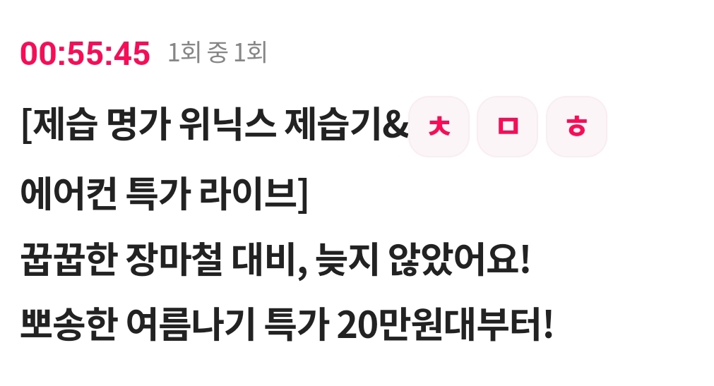 카테고리 없음 [제습 명가 위닉스 제습기&ㅊ ㅁ ㅎ 에어컨 특가 라이브] 꿉꿉한 장마철 대비, 늦지 않았어요! 뽀송한 여름나기 특가 20만원대부터! by 갑자_ 2023. 7. 5. [제습 명가 위닉스 제습기&ㅊ ㅁ ㅎ 에어컨 특가 라이브]꿉꿉한 장마철 대비, 늦지 않았어요!뽀송한 여름나기 특가 20만원대부터!정답 복사 → : 창문형 반응형 공유하기 게시글 관리 퀴즈 정답(실시간) 카톡으로 공유하기 댓글