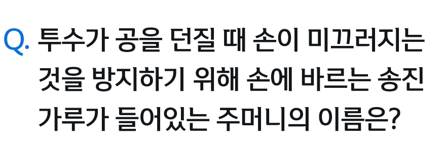 카테고리 없음 신한쏠 야구 퀴즈 투수가 공을 던질 때 손이 미끄러지는 것을 방지하기 위해 손에 바르는 송진 가루가 들어있는 주머니의 이름은? by 갑자_ 2023. 7. 17. 신한쏠 야구 퀴즈 투수가 공을 던질 때 손이 미끄러지는 것을 방지하기 위해 손에 바르는 송진 가루가 들어있는 주머니의 이름은? 정답 복사 → : 로진백 반응형 공유하기 게시글 관리 퀴즈 정답(실시간) 카톡으로 공유하기 댓글