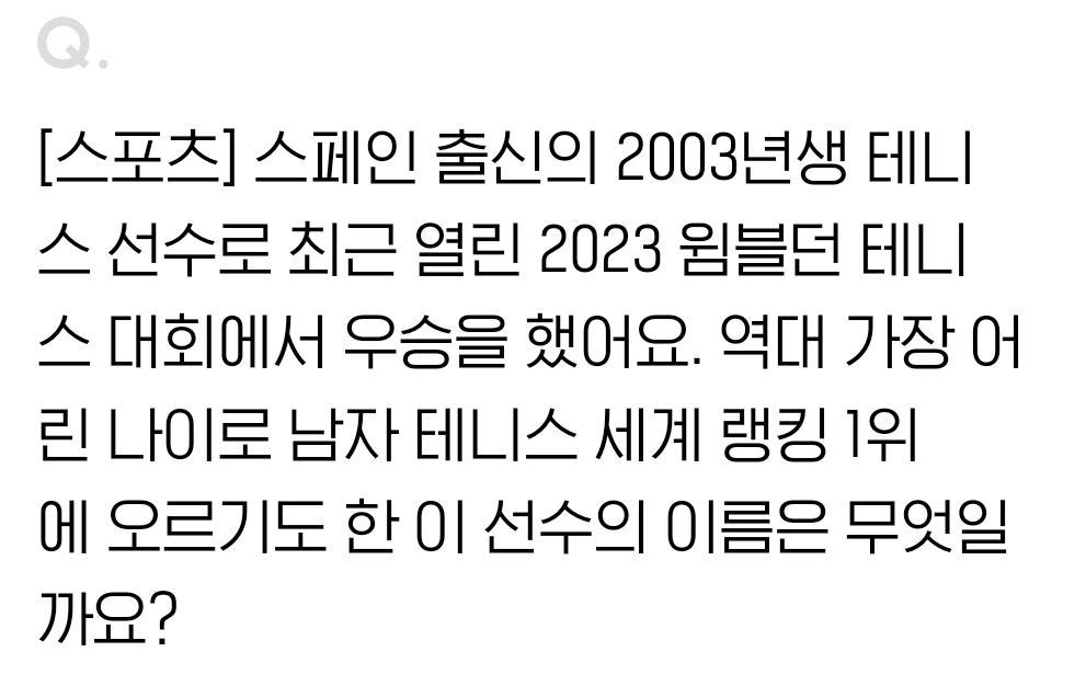카테고리 없음 [스포츠] 스페인 출신의 2003년생 테니스 선수로 최근 열린 2023 윔블던 테니스 대회에서 우승을 했어요. 역대 가장 어린 나이로 남자 테니 by 갑자_ 2023. 7. 20. [스포츠] 스페인 출신의 2003년생 테니스 선수로 최근 열린 2023 윔블던 테니스 대회에서 우승을 했어요. 역대 가장 어린 나이로 남자 테니스 세계 랭킹 1위에 오르기도 한 이 선수의 이름은 무엇일까요?정답 복사 → : 카를로스 알카라스 반응형 공유하기 게시글 관리 퀴즈 정답(실시간) 카톡으로 공유하기 댓글