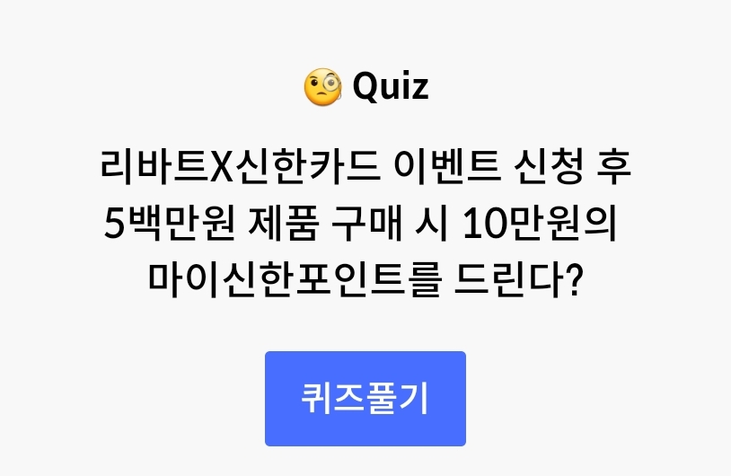 카테고리 없음 Quiz 리바트신한카드 이벤트 신청 후 5백만원 제품 구매 시 10만원의 마이신한포인트를 드린다? by 갑자_ 2023. 7. 25. Quiz리바트신한카드 이벤트 신청 후5백만원 제품 구매 시 10만원의마이신한포인트를 드린다?정답 복사 → : O 반응형 공유하기 게시글 관리 퀴즈 정답(실시간) 카톡으로 공유하기 댓글