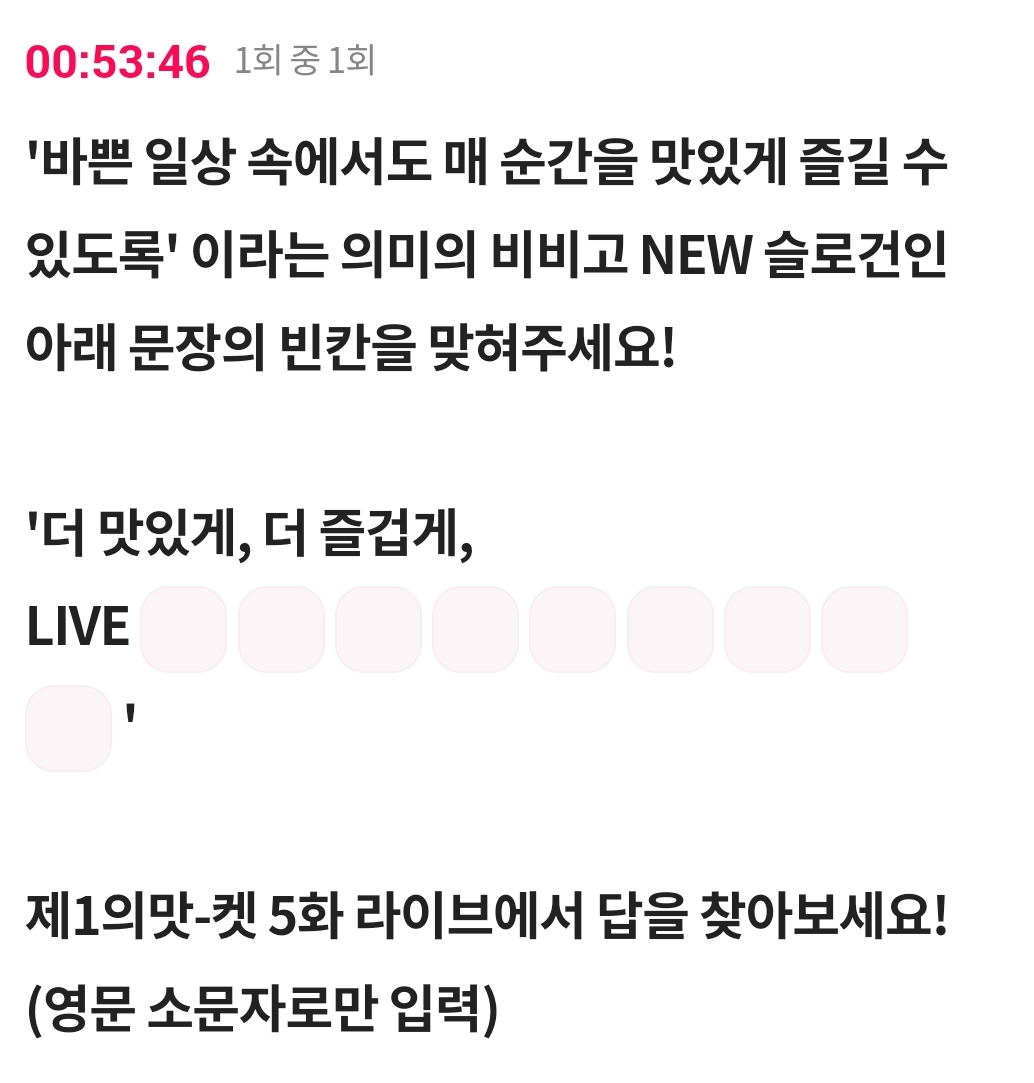 카테고리 없음 바쁜 일상 속에서도 매 순간을 맛있게 즐길 수 있도록' 이라는 의미의 비비고 NEW 슬로건인 아래 문장의 빈칸을 맞혀주세요! '더 맛있게, 더 by 갑자_ 2023. 8. 23. 바쁜 일상 속에서도 매 순간을 맛있게 즐길 수 있도록' 이라는 의미의 비비고 NEW 슬로건인 아래 문장의 빈칸을 맞혀주세요!'더 맛있게, 더 즐겁게,LIVE '제1의맛-켓 5화 라이브에서 답을 찾아보세요!(영문 소문자로만 입력)정답 복사 → : delicious 반응형 공유하기 게시글 관리 퀴즈 정답(실시간) 카톡으로 공유하기 댓글