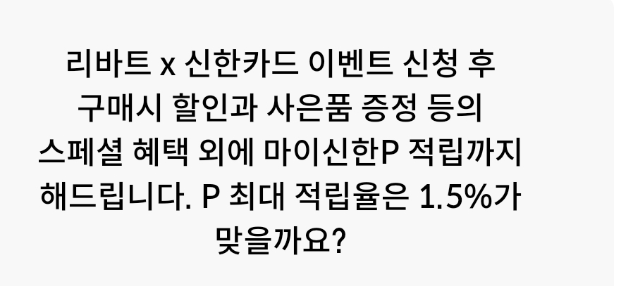 카테고리 없음 리바트 신한카드 이벤트 신청 후 구매시 할인과 사은품 증정 등의 스페셜 혜택 외에 마이신한P 적립까지 해드립니다. P 최대 적립율은 1.5%가 by 갑자_ 2023. 8. 24. 리바트 신한카드 이벤트 신청 후구매시 할인과 사은품 증정 등의스페셜 혜택 외에 마이신한P 적립까지해드립니다. P 최대 적립율은 1.5%가맞을까요? 정답 복사 → : O 반응형 공유하기 게시글 관리 퀴즈 정답(실시간) 카톡으로 공유하기 댓글