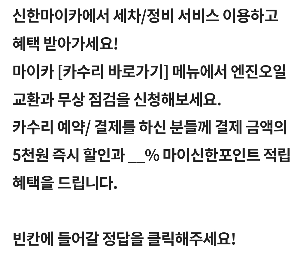 카수리 예약/ 결제를 하신 분들께 결제 금액의 5천원 즉시 할인과 __% 마이신한포인트 적립 혜택을 드립니다.
