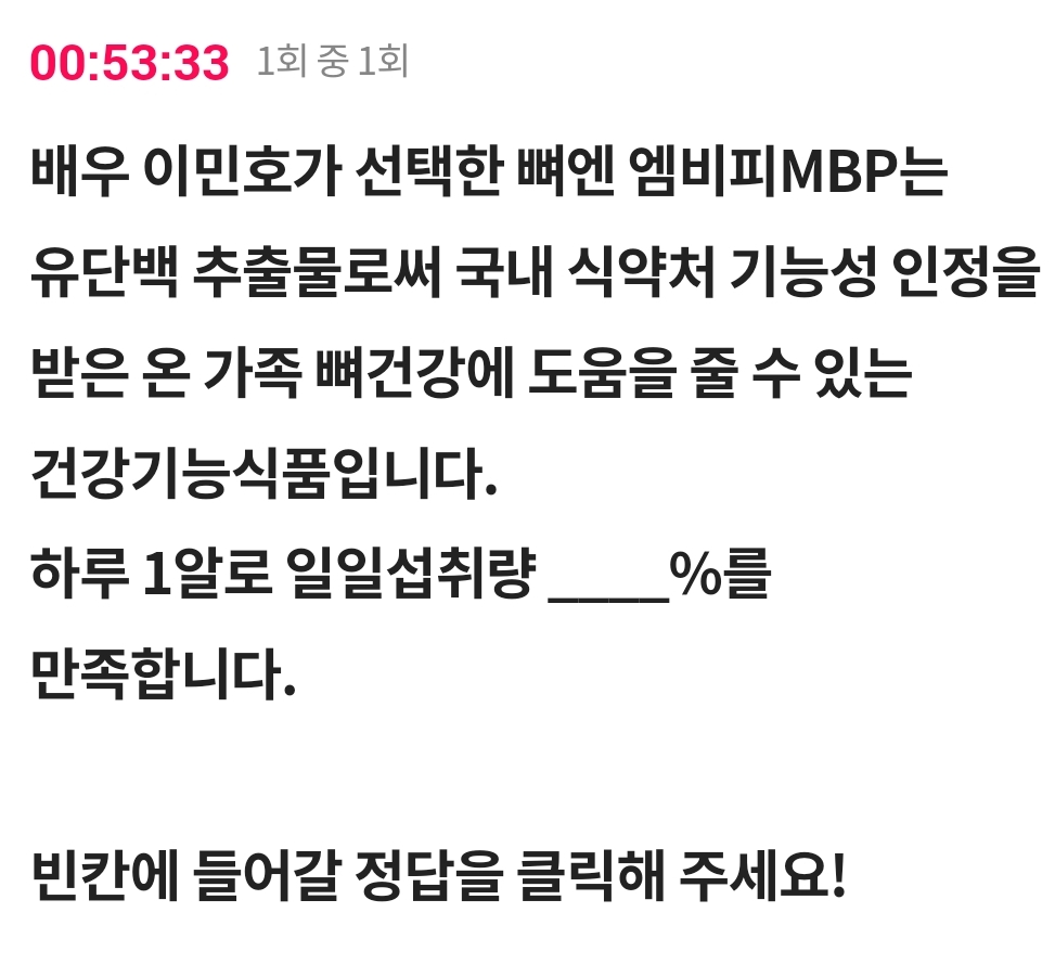 배우 이민호가 선택한 뼈엔 엠비피MBP는 유단백 추출물로써 국내 식약처 기능성 인정을 받은 온 가족 뼈건강에 도움을 줄 수 있는 건강기능식품입니다.