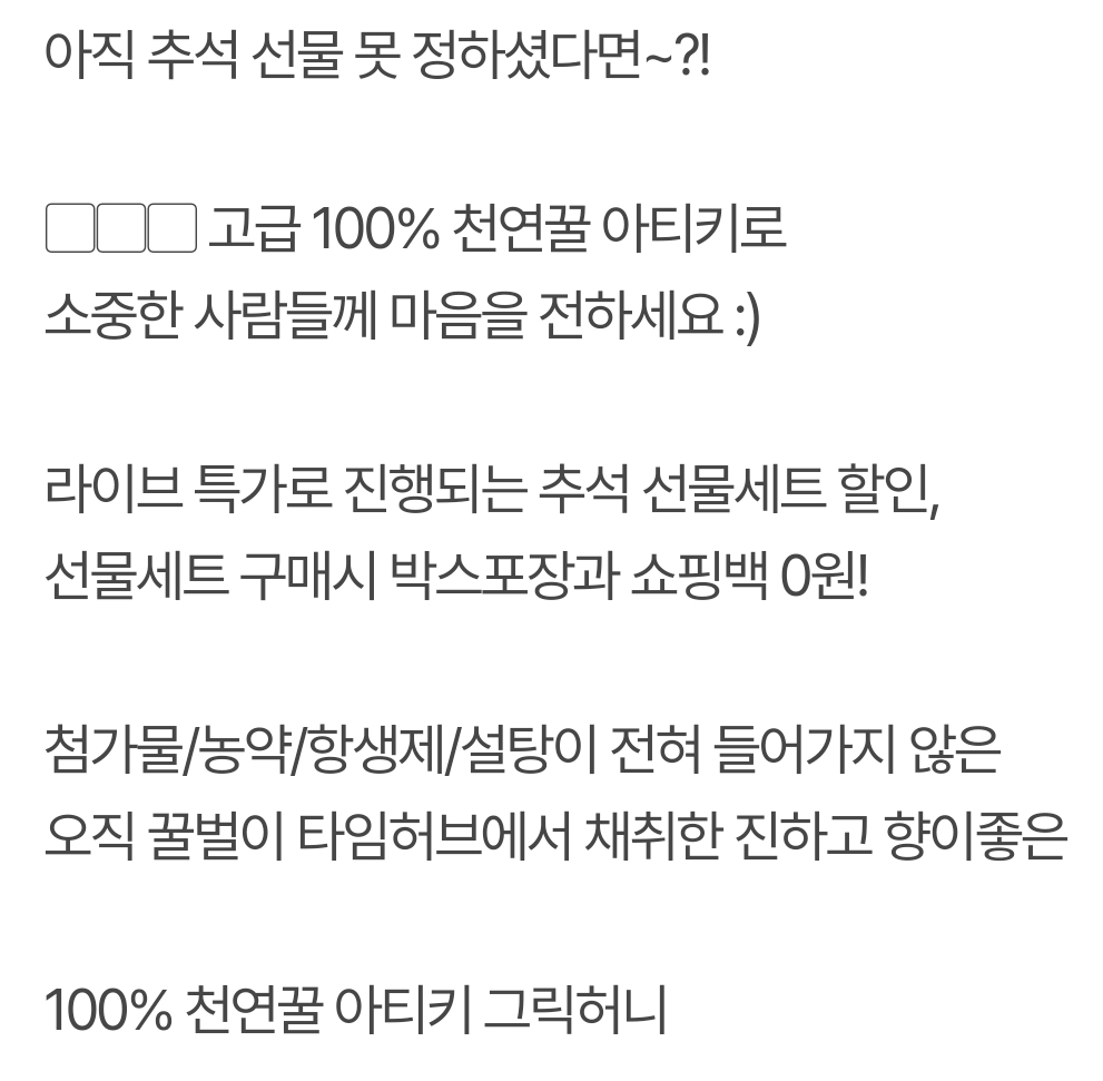 카테고리 없음 아직 추석 선물 못 정하셨다면~?! ▢▢▢ 고급 100% 천연꿀 아티키로 소중한 사람들께 마음을 전하세요 :) 라이브 특가로 진행되는 추석 by 갑자_ 2023. 9. 15. 아직 추석 선물 못 정하셨다면~?!▢▢▢ 고급 100% 천연꿀 아티키로소중한 사람들께 마음을 전하세요 :)라이브 특가로 진행되는 추석 선물세트 할인,선물세트 구매시 박스포장과 쇼핑백 0원!첨가물/농약/항생제/설탕이 전혀 들어가지 않은오직 꿀벌이 타임허브에서 채취한 진하고 향이좋은100% 천연꿀 아티키 그릭허니정답 복사 → : 그리스 반응형 공유하기 게시글 관리 퀴즈 정답(실시간) 카톡으로 공유하기 댓글