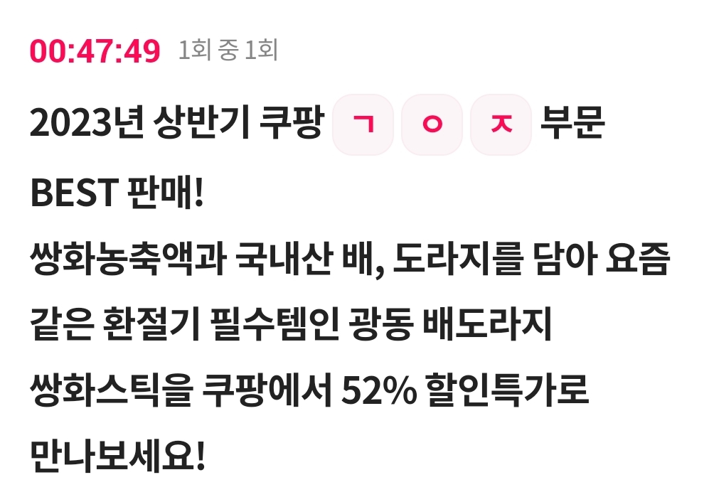 카테고리 없음 2023년 상반기 쿠팡 ㄱ ㅇ ㅈ 부문 BEST 판매! 쌍화농축액과 국내산 배, 도라지를 담아 요즘 같은 환절기 필수템인 광동 배도라지 쌍화스틱 by 갑자_ 2023. 9. 18. 2023년 상반기 쿠팡 ㄱ ㅇ ㅈ 부문 BEST 판매!쌍화농축액과 국내산 배, 도라지를 담아 요즘 같은 환절기 필수템인 광동 배도라지 쌍화스틱을 쿠팡에서 52% 할인특가로 만나보세요!정답 복사 → : 과일즙 반응형 공유하기 게시글 관리 퀴즈 정답(실시간) 카톡으로 공유하기 댓글
