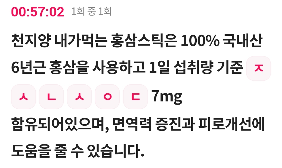 천지양 내가먹는 홍삼스틱은 100% 국내산 6년근 홍삼을 사용하고 1일 섭취량 기준 ㅈ ㅅ ㄴ ㅅ ㅇ ㄷ 7mg 함유되어있으며, 면역력 증진과 피로개선에 도움을 줄 수 있습니다.