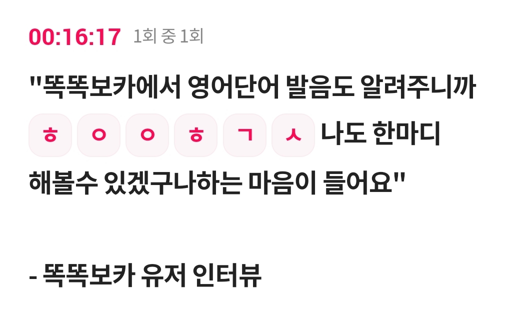카테고리 없음 똑똑보카에서 영어단어 발음도 알려주니까 ㅎ ㅇ ㅇ ㅎ ㄱ ㅅ 나도 한마디 해볼수 있겠구나하는 마음이 들어요" - 똑똑보카 유저 인터뷰 by 갑자_ 2023. 10. 14. 똑똑보카에서 영어단어 발음도 알려주니까 ㅎ ㅇ ㅇ ㅎ ㄱ ㅅ 나도 한마디 해볼수 있겠구나하는 마음이 들어요"- 똑똑보카 유저 인터뷰똑똑보카에서 영어단어 발음도 알려주니까 ㅎ ㅇ ㅇ ㅎ ㄱ ㅅ 나도 한마디 해볼수 있겠구나하는 마음이 들어요"- 똑똑보카 유저 인터뷰정답 복사 → : 해외여행가서 반응형 공유하기 게시글 관리 퀴즈 정답(실시간) 카톡으로 공유하기 댓글