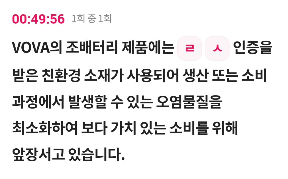 VOVA의 조배터리 제품에는 ㄹ ㅅ 인증을 받은 친환경 소재가 사용되어 생산 또는 소비 과정에서 발생할 수 있는 오염물질을 최소화하여 보다 가치 있는 소비를 위해 앞장서고 있습니다.