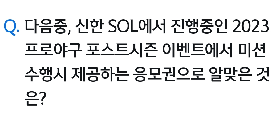 카테고리 없음 Q. 다음중, 신한 SOL에서 진행중인 2023 프로야구 포스트시즌 이벤트에서 미션 수행시 제공하는 응모권으로 알맞은 것 은? by 갑자_ 2023. 10. 20. Q. 다음중, 신한 SOL에서 진행중인 2023프로야구 포스트시즌 이벤트에서 미션수행시 제공하는 응모권으로 알맞은 것은?Q. 다음중, 신한 SOL에서 진행중인 2023프로야구 포스트시즌 이벤트에서 미션수행시 제공하는 응모권으로 알맞은 것은?정답 복사 → : 은행잎 반응형 공유하기 게시글 관리 퀴즈 정답(실시간) 카톡으로 공유하기 댓글