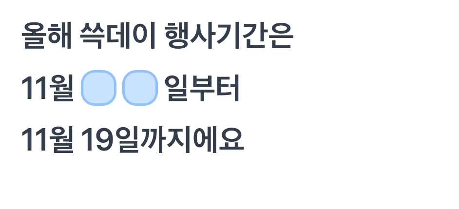 카테고리 없음 올해 쑥데이 행사기간은 11월 00일부터 11월 19일까지에요 by 갑자_ 2023. 11. 13. 올해 쑥데이 행사기간은 11월 00일부터 11월 19일까지에요올해 쑥데이 행사기간은 11월 00일부터 11월 19일까지에요정답 복사 → : 13정답 복사 → : 100정답 복사 → : 9 반응형 공유하기 게시글 관리 퀴즈 정답(실시간) 카톡으로 공유하기 댓글