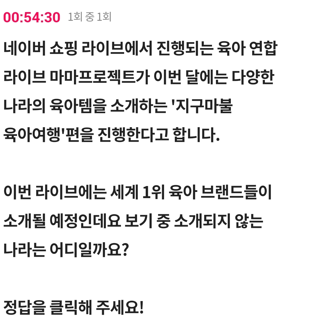 카테고리 없음 네이버 쇼핑 라이브에서 진행되는 육아 연합 라이브 마마프로젝트가 이번 달에는 다양한 나라의 육아템을 소개하는 '지구마불 육아여행'편을 진행한다고 by 갑자_ 2023. 11. 15. 네이버 쇼핑 라이브에서 진행되는 육아 연합 라이브 마마프로젝트가 이번 달에는 다양한 나라의 육아템을 소개하는 '지구마불 육아여행'편을 진행한다고 합니다.이번 라이브에는 세계 1위 육아 브랜드들이 소개될 예정인데요 보기 중 소개되지 않는 나라는 어디일까요?정답을 클릭해 주세요!정답 복사 → : 캐나다 반응형 공유하기 게시글 관리 퀴즈 정답(실시간) 카톡으로 공유하기 댓글