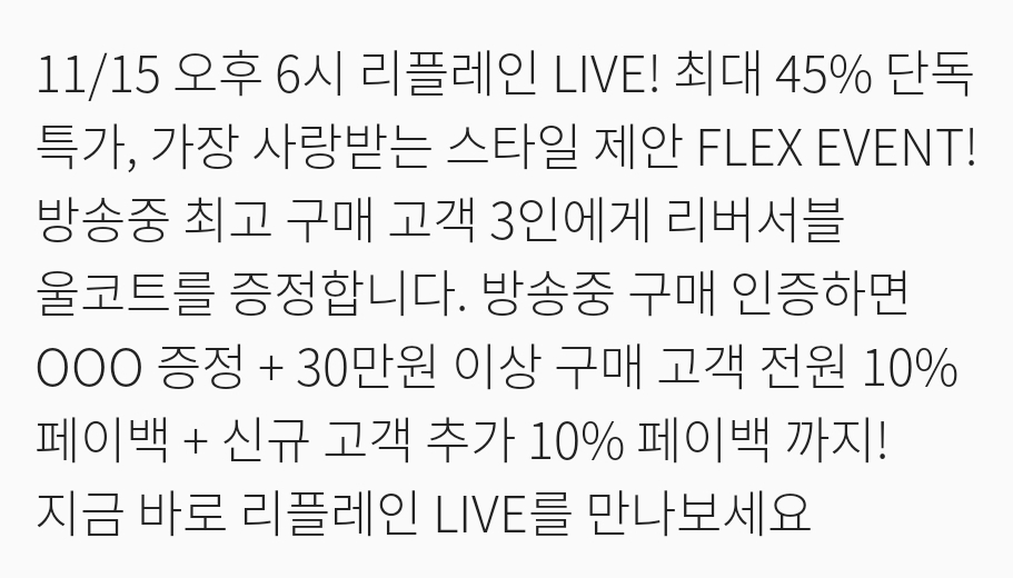 11/15 오후 6시 리플레인 LIVE! 최대 45% 단독 특가, 가장 사랑받는 스타일 제안 FLEX EVENT! 방송중 최고 구매 고객 3인에게 리버서블 울코트를 증정합니다. 방송중 구매 인증하면 OOO 증정 + 30만원 이상 구매 고객 전원 10% 페이백 + 신규 고객 추가 10% 페이백 까지! 지금 바로 리플레인 LIVE를 만나보세요