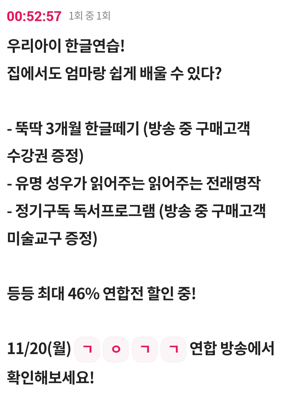 카테고리 없음 우리아이 한글연습! 집에서도 엄마랑 쉽게 배울 수 있다? - 뚝딱 3개월 한글떼기 (방송 중 구매고객 수강권 증정) - 유명 성우가 읽어주 by 갑자_ 2023. 11. 20. 우리아이 한글연습!집에서도 엄마랑 쉽게 배울 수 있다?- 뚝딱 3개월 한글떼기 (방송 중 구매고객 수강권 증정)- 유명 성우가 읽어주는 읽어주는 전래명작- 정기구독 독서프로그램 (방송 중 구매고객 미술교구 증정)등등 최대 46% 연합전 할인 중!11/20(월) ㄱ ㅇ ㄱ ㄱ 연합 방송에서 확인해보세요!정답 복사 → : 교육교구 반응형 공유하기 게시글 관리 퀴즈 정답(실시간) 카톡으로 공유하기 댓글