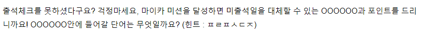 출석체크를 못하셨다구요? 걱정마세요, 마이카 미션을 달성하면 미출석일을 대체할 수 있는 OOOOOO과 포인트를 드리니까요! OOOOOO안에 들어갈 단어는 무엇일까요? (힌트 : ㅍㄹㅍㅅㄷㅈ)