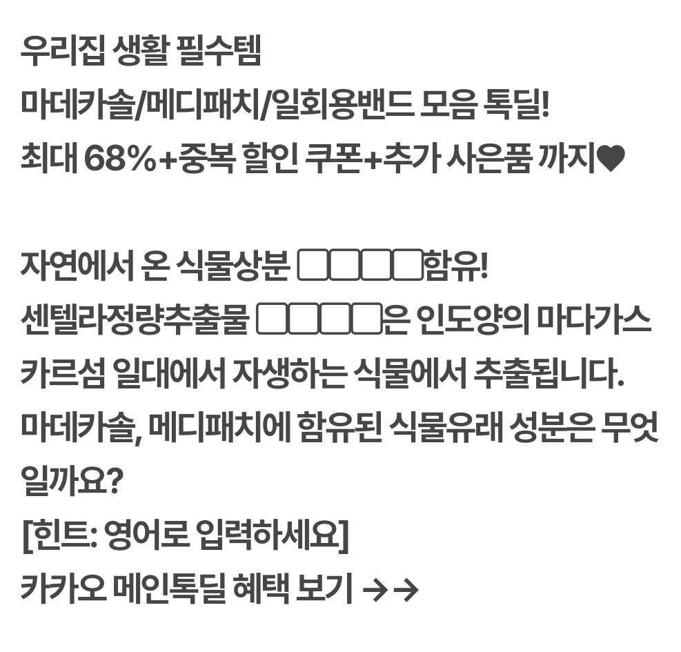 시럽 우리집 생활 필수템 마데카솔/메디패치/일회용밴드 모음 톡딜! 최대 68%+중복 할인 쿠폰+추가 사은품 까지♥ 자연에서 온 식물상분 ▢▢▢▢함유! 센텔라정량추출물 ▢▢▢▢은